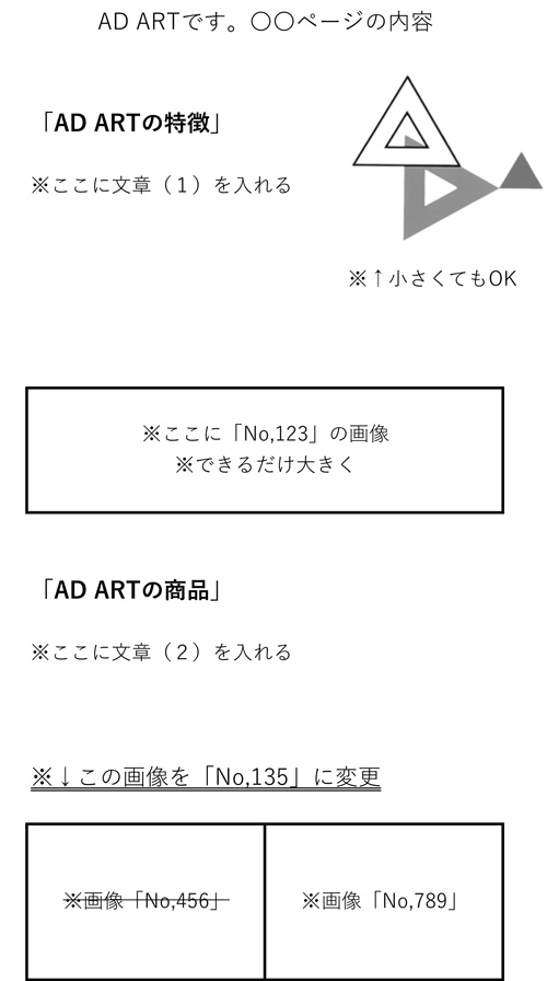 文章や画像の「配置・レイアウト・サイズ」などは「お任せ」でも大丈夫でございます。特に「何らかのご希望」がある場合には「矢印や注釈など」でわかるようにご記入ください。