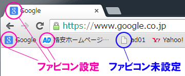 なお、ファビコンを設定していないサイトでは、ブラウザのデフォルト画像(例:下サンプルの「青丸」部分)などで表示されます。