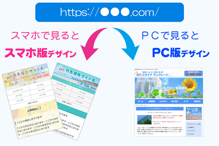 このため、ごく一般的な「スマホユーザー」には見やすさを重視したスマホ版デザインで見てもらい、会社など「パソコン」からの訪問ではオリジナリティのあるPC版デザインを見てもらうことができます。