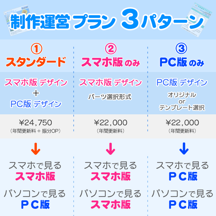 初回の制作料は「スマホ版・PC版オリジナルデザイン・PC版テンプレートデザイン」の中からご選択でき、最安は「¥4,400」です!